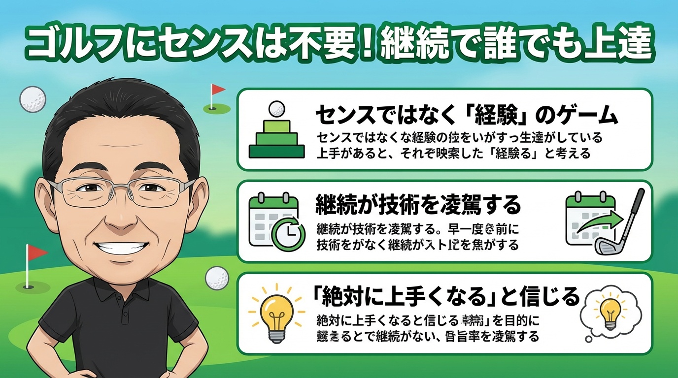 そんな不安を抱えていませんか?こんにちは、ティーチングプロの野山佳治です。 日々、多くのゴルファーの方々にゴルフレッスンを提供している中で、最も多く耳にする悩みが「センスの有無」についてです。しかし、断言します。ゴルフにセンスは必要ありません。正しい方法で「継続」さえすれば、誰でも必ず上達し、理想のスコアを出すことができます。