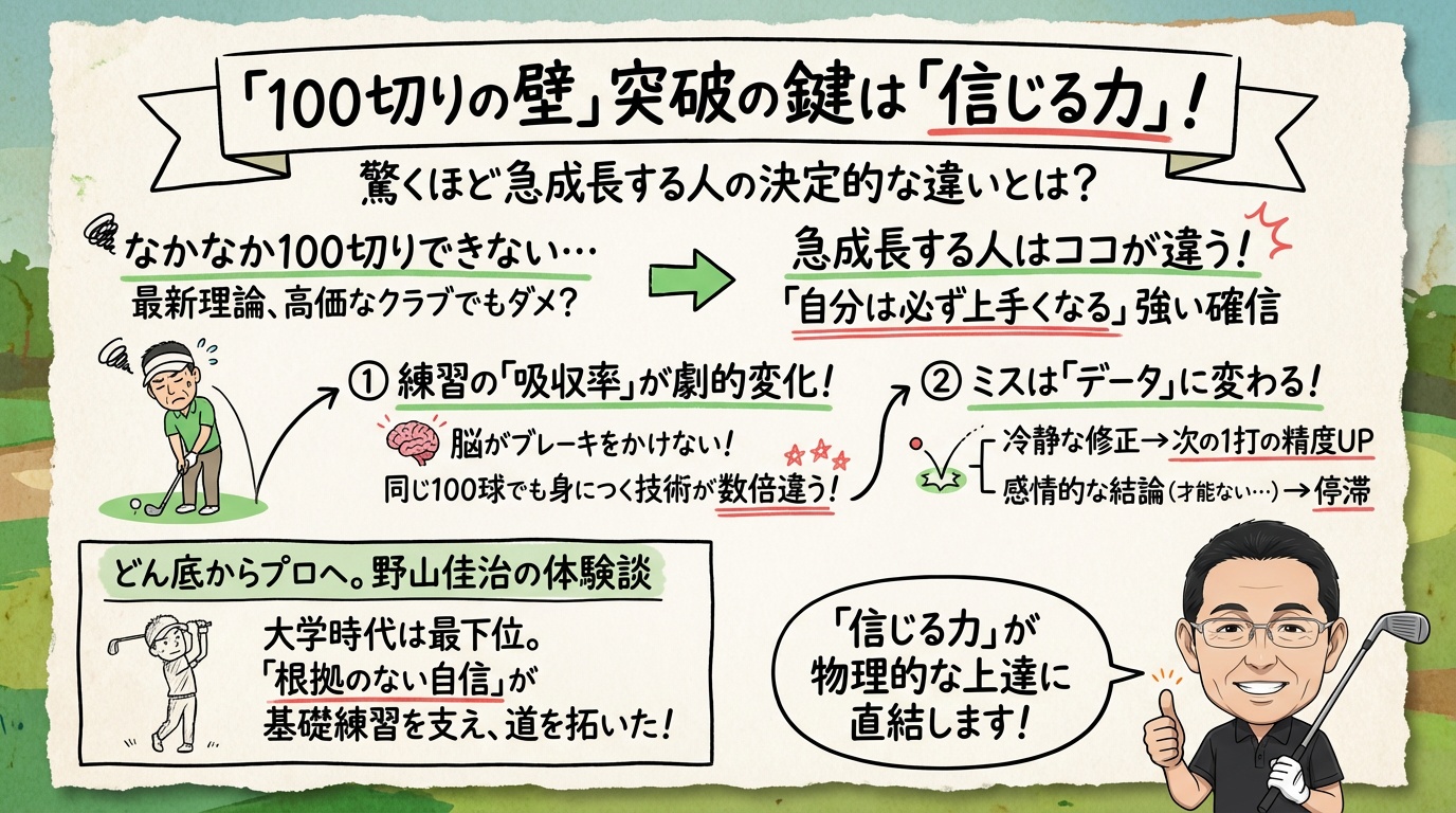 この違いは「自分は必ず上手くなる」という強い確信を持っているかどうか、という点に尽きます。本記事では、精神論として片付けられがちな「信じる力」を、練習効率、そして実戦でのコースマネジメントの観点から論理的に解説します。